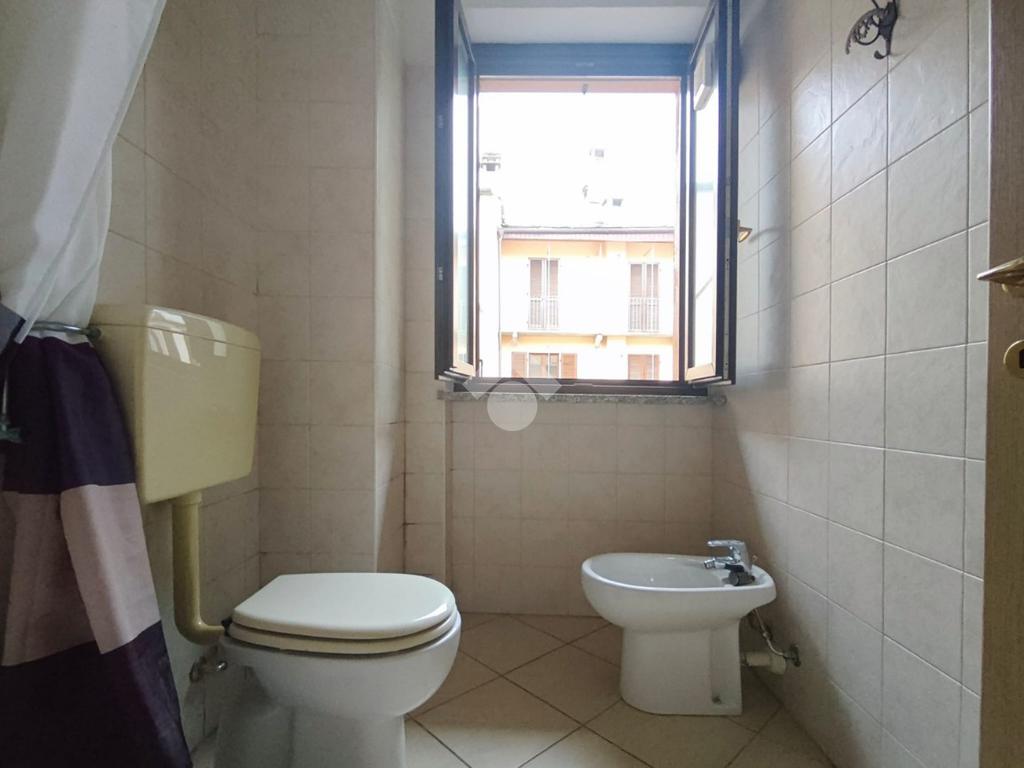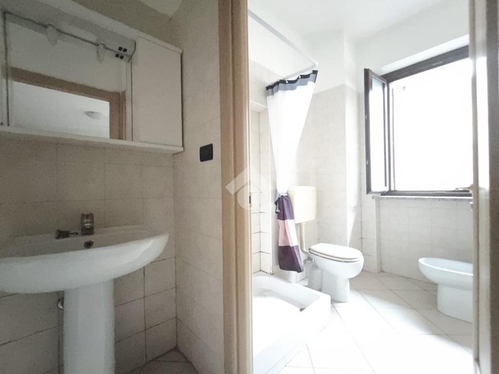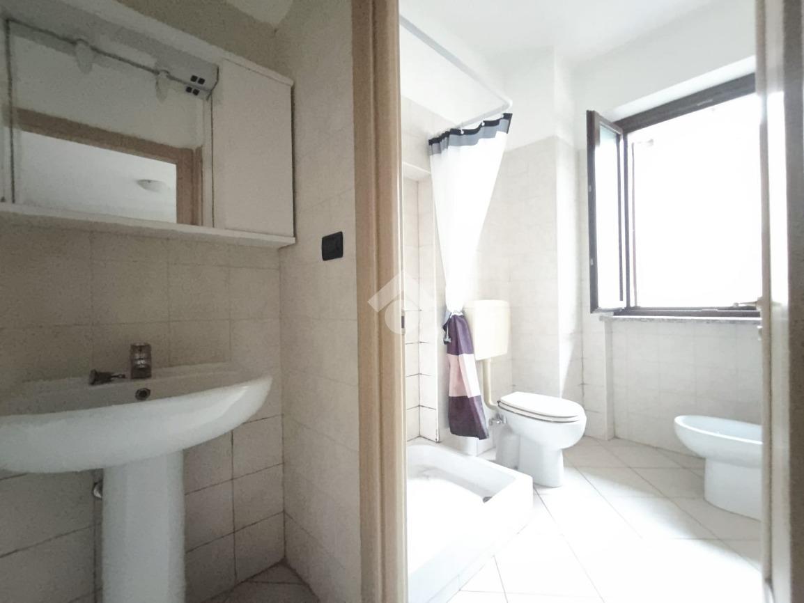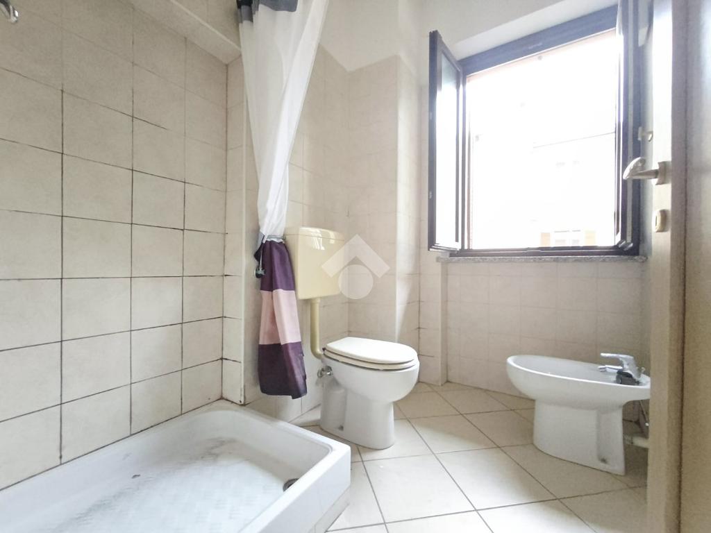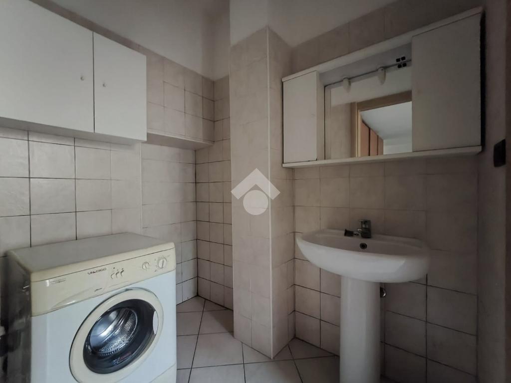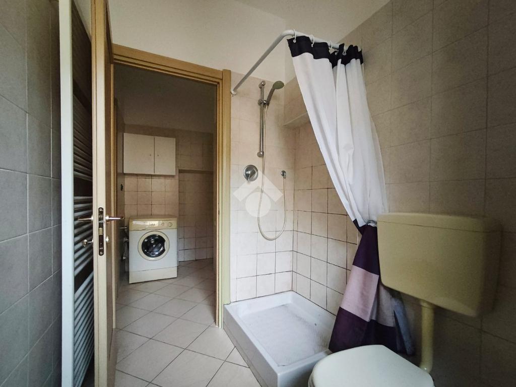 Il bagno è spazioso e finestrato, dotato di box doccia, sanitari completi e un disimpegno con lavatrice già installata.