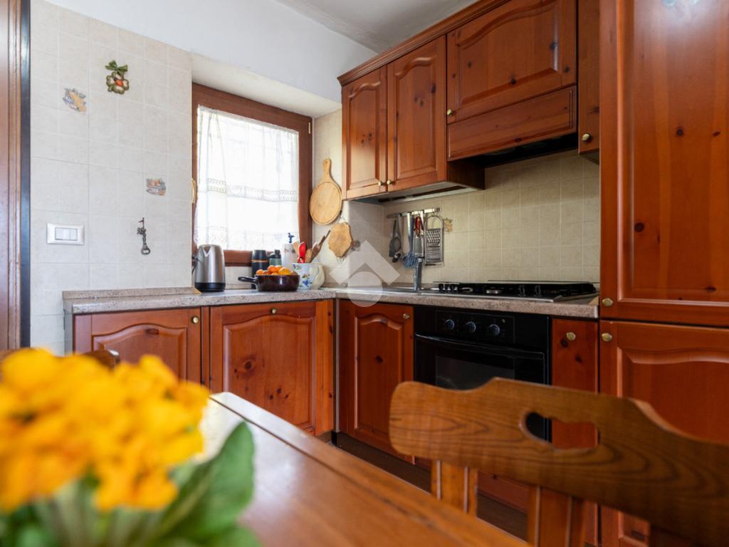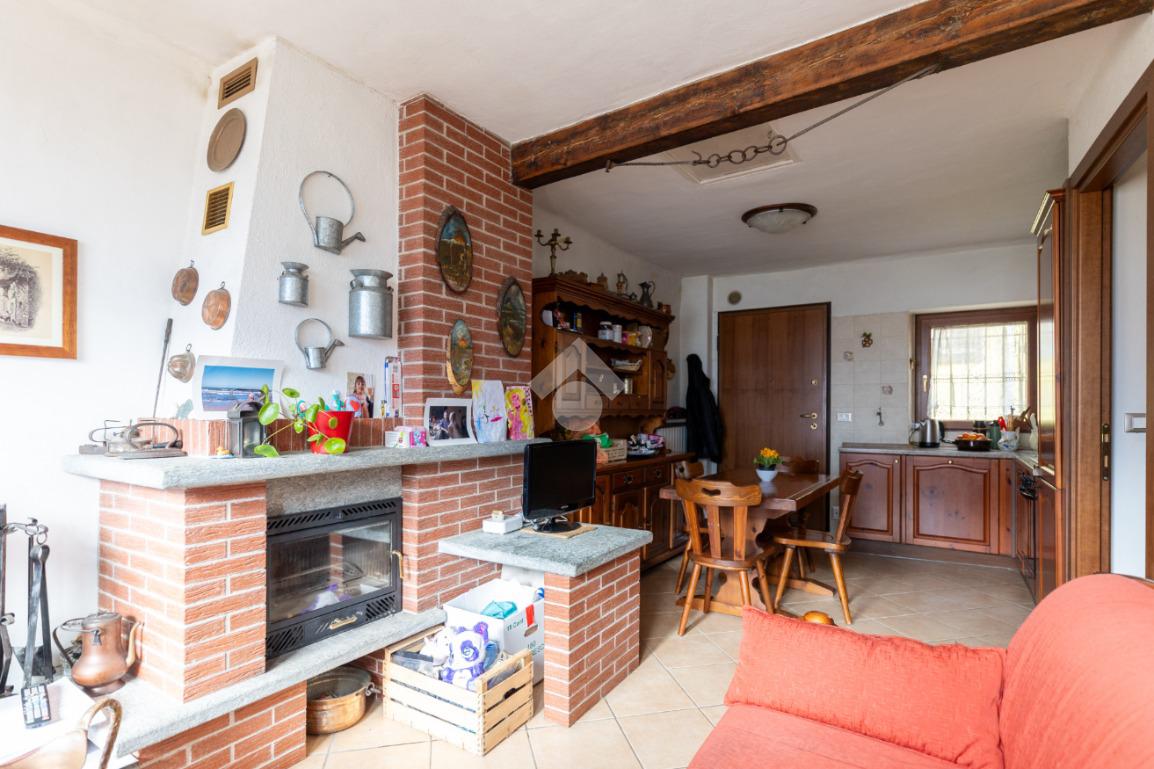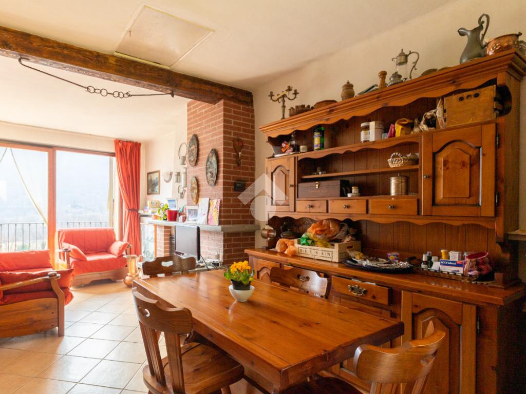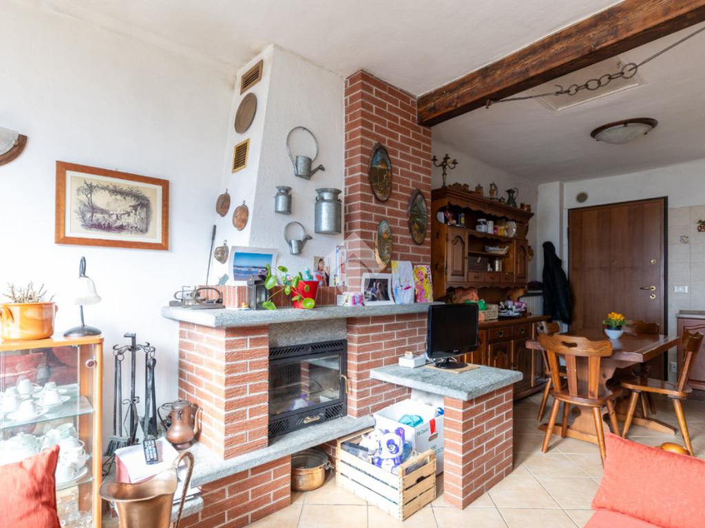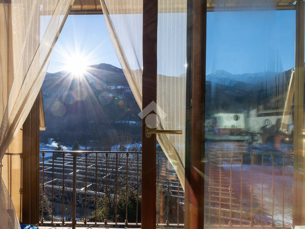 Gli interni sono curati e accoglienti. L’ingresso si apre direttamente sulla zona giorno in ambiente living, impreziosita dalla presenza di un caminetto e da una splendida vetrata scorrevole che, orientata a sud, regala una vista aperta sulla valle opposta. Da qui si accede a una balconata panoramica, sulla quale affaccia anche la camera da letto, creando una piacevole continuità tra gli ambienti.